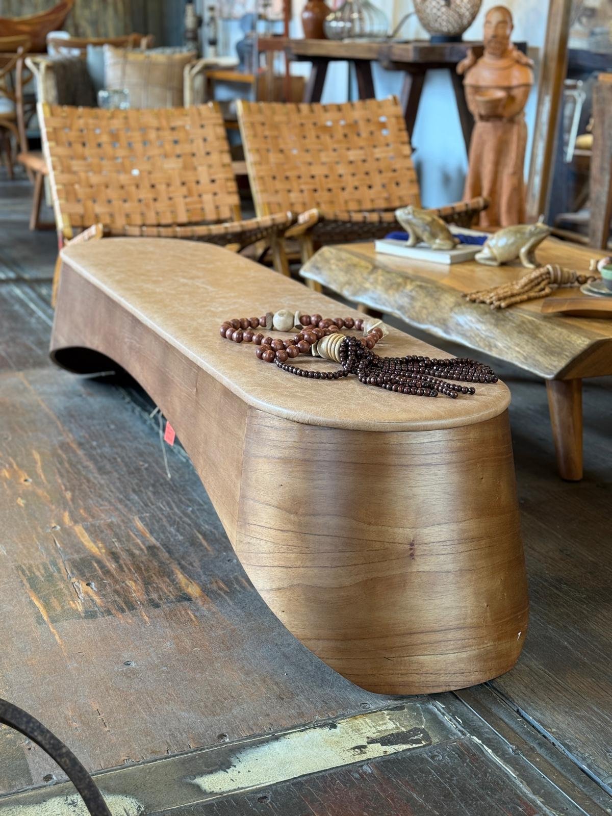 O Banco de Madeira e Couro valoriza cada ambiente ao unir forma, função e matéria-prima nobre. Ele apresenta uma base em madeira maciça multilaminada ou Cinamomo Âmbar, criando um visual sólido e elegante.