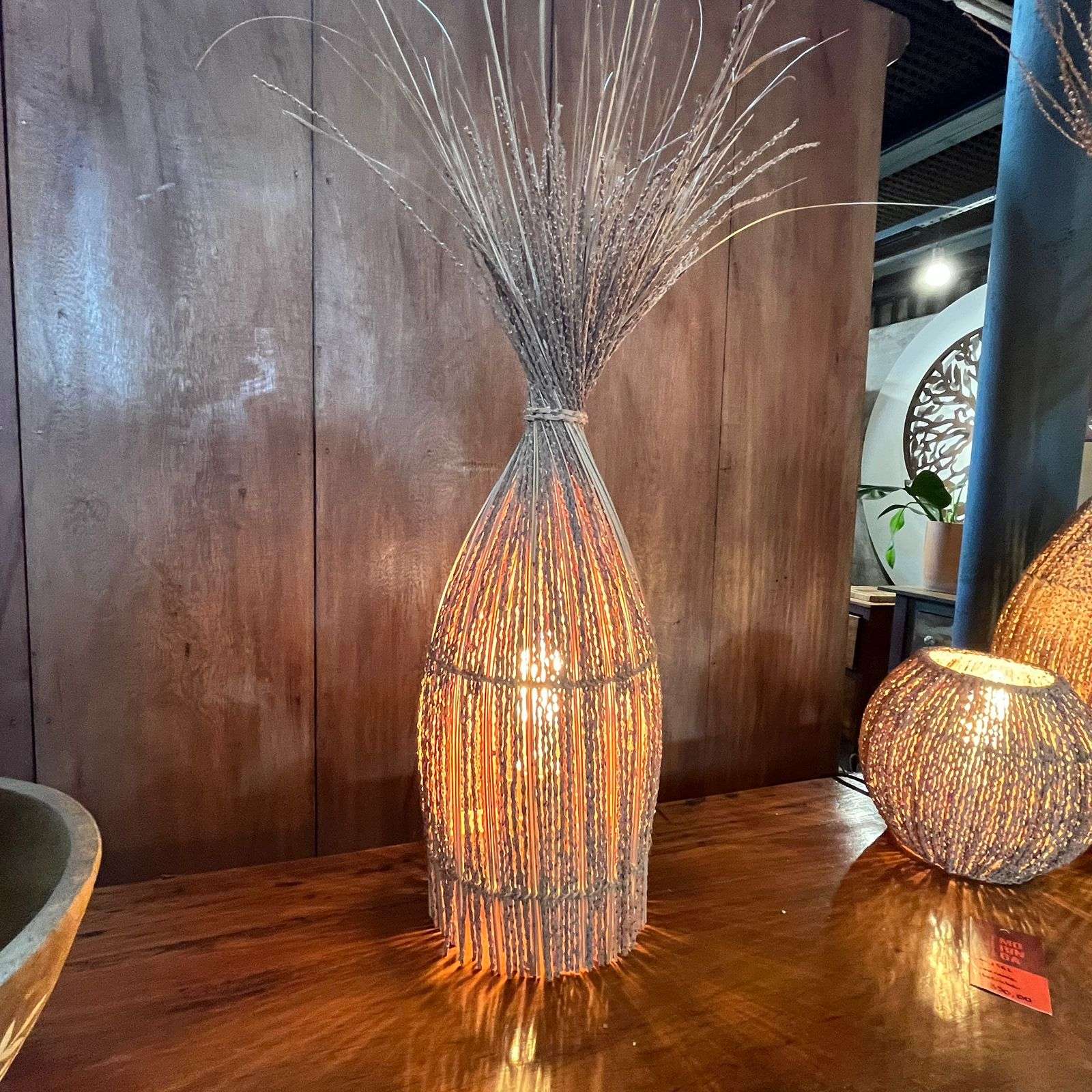 A Luminária de Mesa em Fibra Natural de Açaí é uma peça artesanal que une design rústico e elegância orgânica. Feita à mão com fibras naturais de açaí, destaca-se pelo cuidado nos detalhes e pela beleza autêntica de um material sustentável e exclusivo.